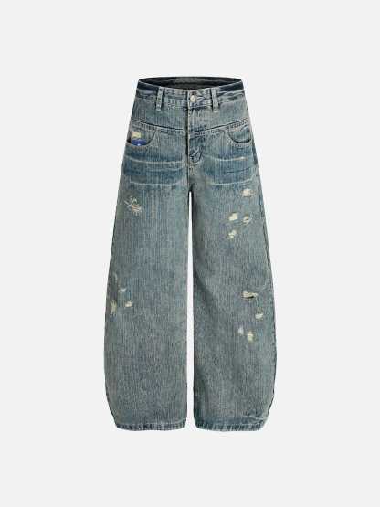 Not your regular jeans—these distressed barrel pants flip the script with a double back-pocket illusion that adds instant edge. The ripped details are scattered in an offbeat, asymmetrical way, giving them a raw, rebellious vibe. Topped with a unique waistband design, they push streetwear into a more individual lane. Oversized barrel legs keep the fit laid-back yet bold.