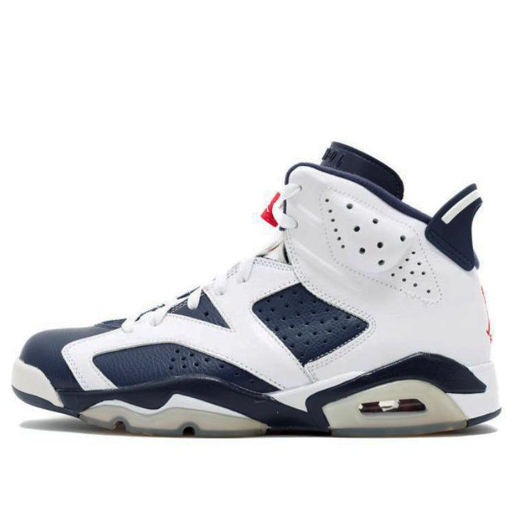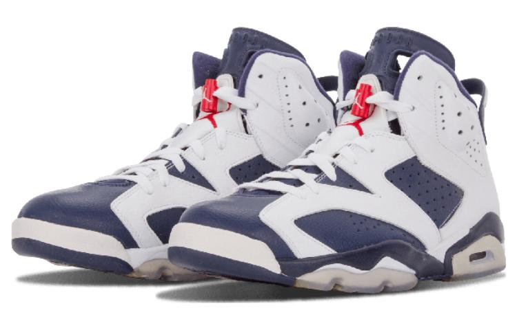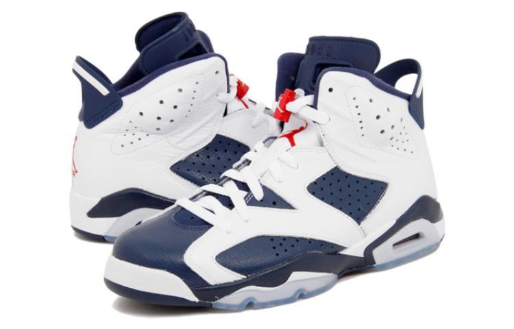 The Air Jordan 6 Retro "Olympics" was first worn by NBA stars Ray Allen and Vin Baker of Team USA as they won gold in Sydney at the 2000 Olympic games. A must-have for any Nike Air Jordan fan, these sneakers were originally released to the public in September of 2000 and retroed in 2012 to commemorate the London Olympic Games. The 2012 Air Jordan 6 Retro "Olympic" sneakers differ slightly from the 2000 release with its navy midsole (instead of white) but it retains the icy blue translucent outsole and traditional Air Jumpman branding elements. Whether you're an avid Nike Air Jordan collector or simply looking for a great addition to your sneaker rotation, the Air Jordan 6 Retro "Olympics"