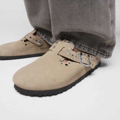 The BIRKENSTOCK Boston is a veritable classic that can easily be worn all year round. It has a legendary status thanks to its sophisticated, individually adjustable design. This version features precisely positioned rivets with no back which are made to sit firmly in the leather in an elaborate production process without going too deep, making them unnoticeable when the shoe is worn. It’s quite an eye-catcher! The upper is made from especially soft suede which hugs the foot like a second skin.
