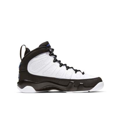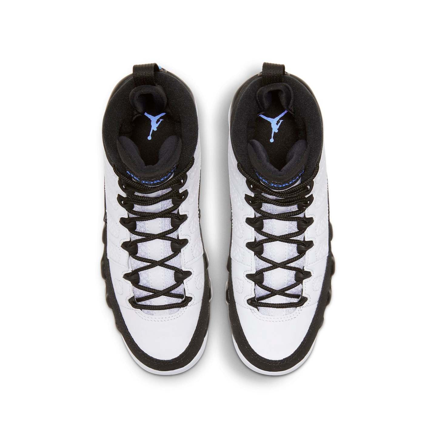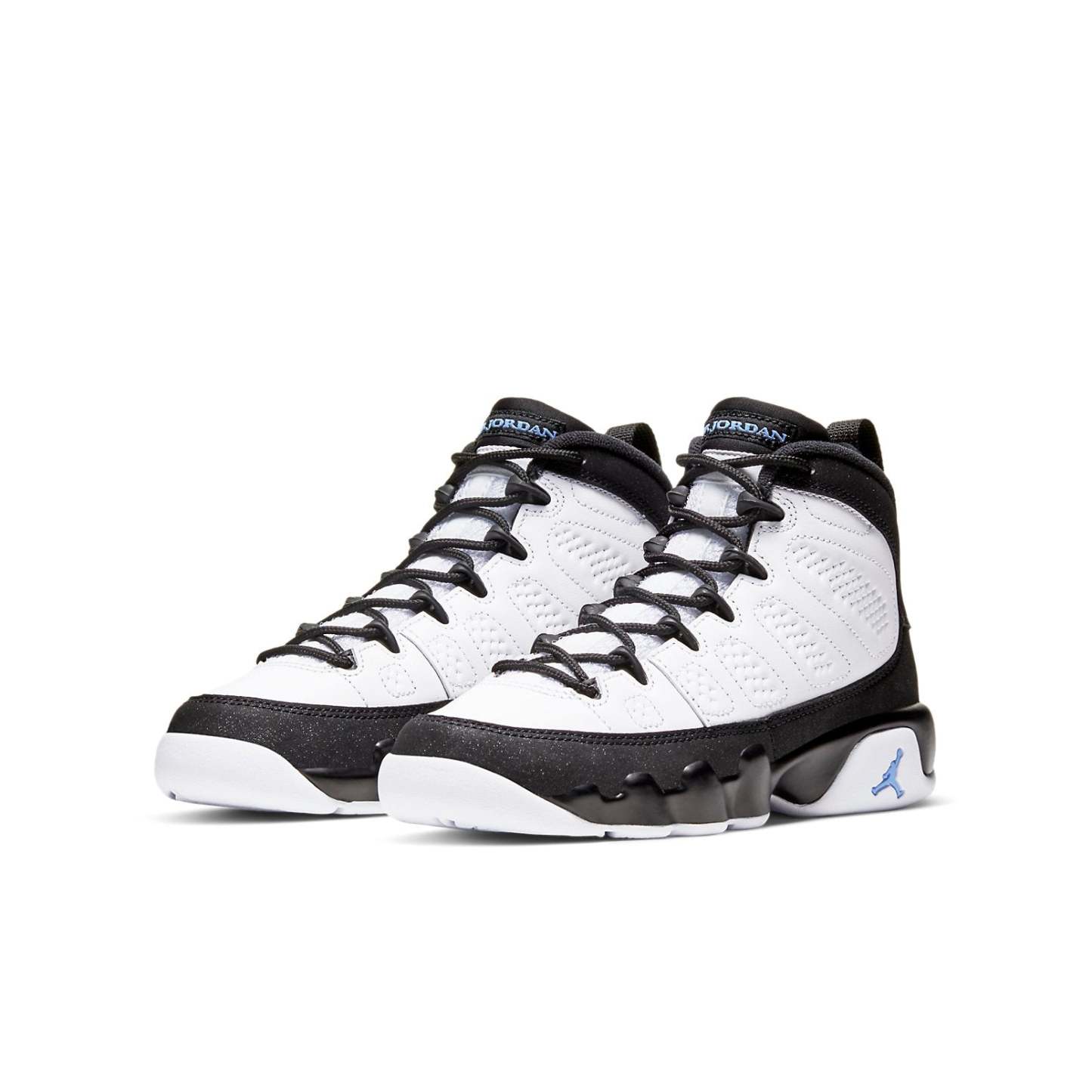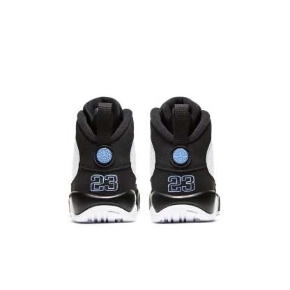 The Air Jordan 9 Retro GS 'University Blue' is a sneaker built for big kids that nod to Michael Jordan's alma mater. The design is reminiscent of Air Jordan 9 PE colorways worn by the likes of Penny Hardaway and Nick Anderson in the mid '90s. A simple white and black palette is executed on the leather upper, secured with non-binding rope laces and accented with powder blue branding hits. They include an embroidered ‘23’ on the heel and a Jumpman icon on the lateral midsole.