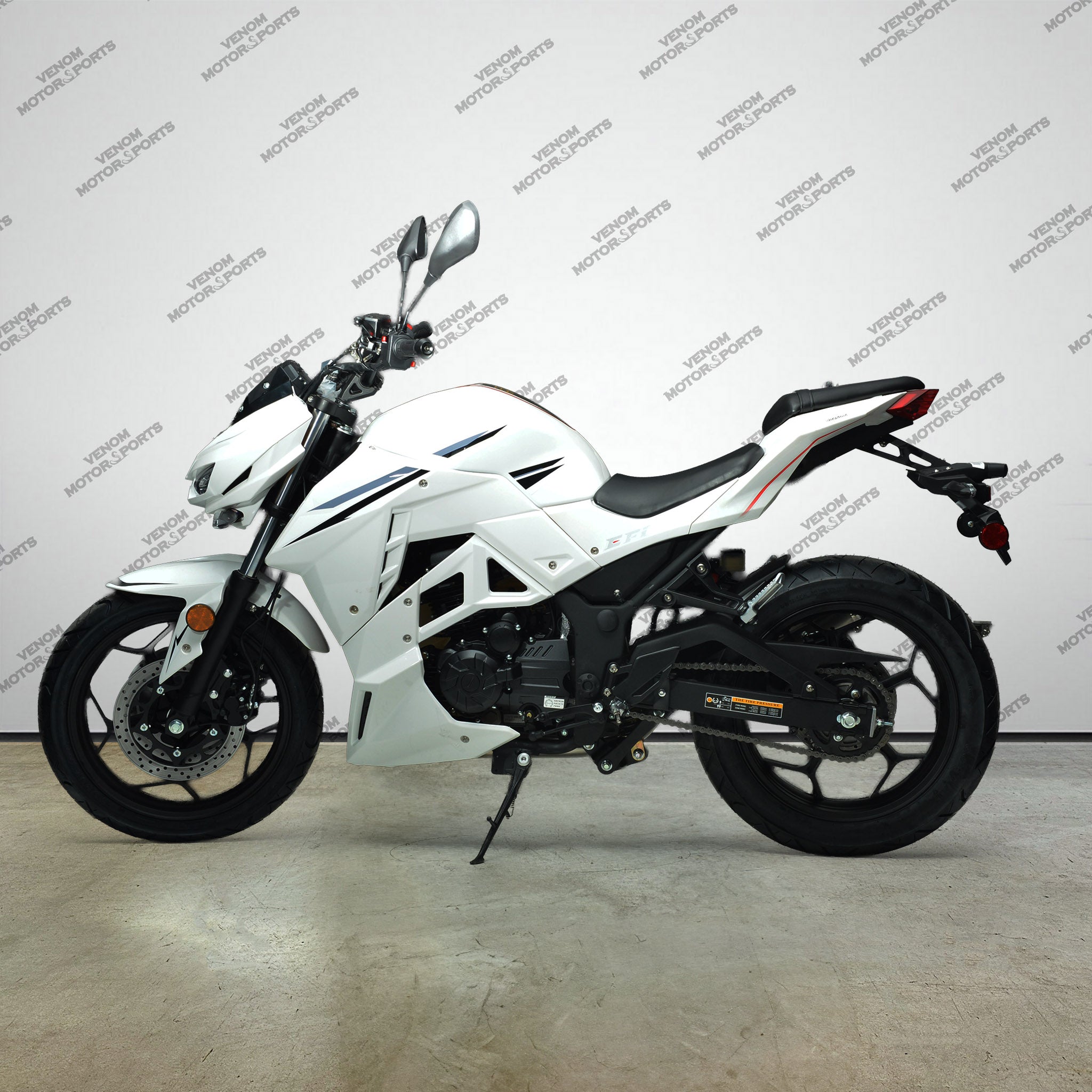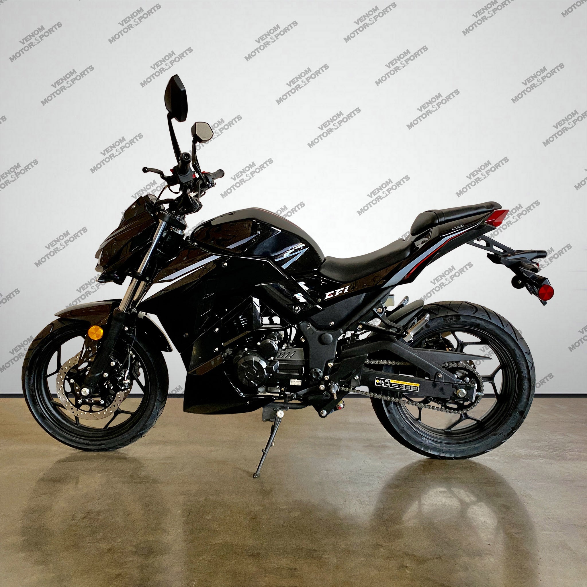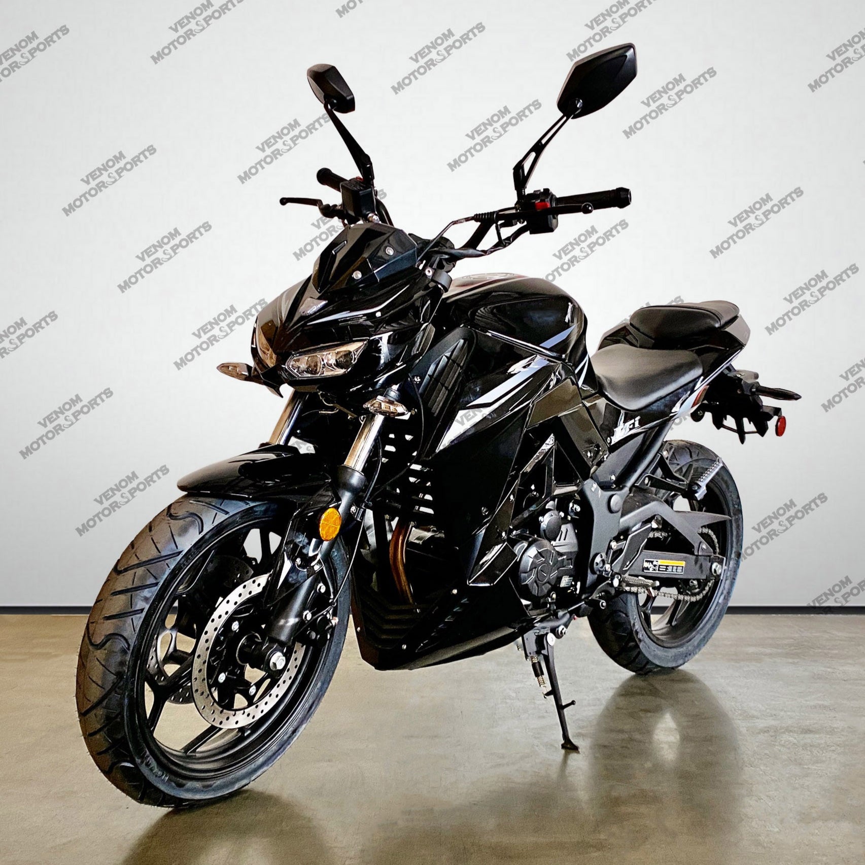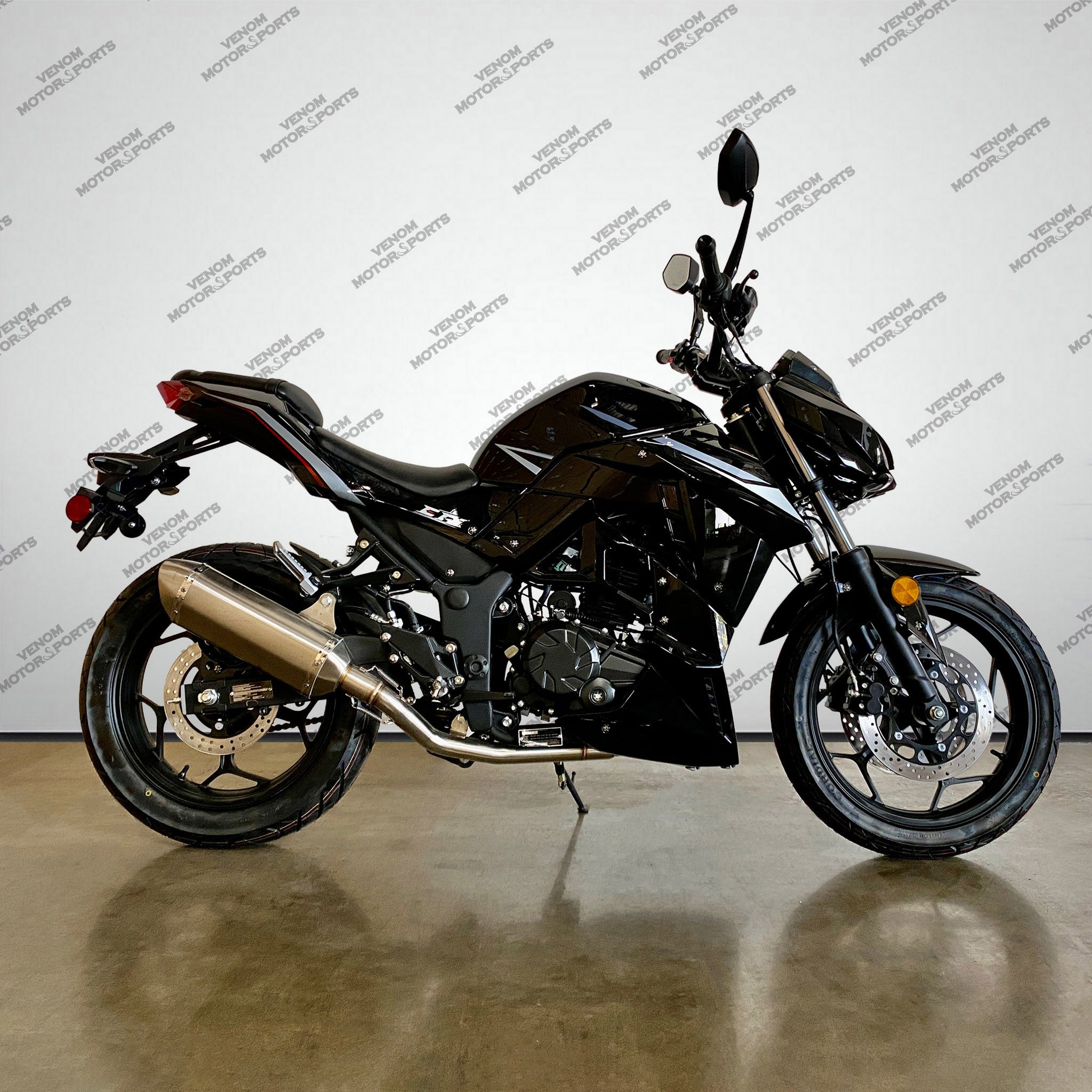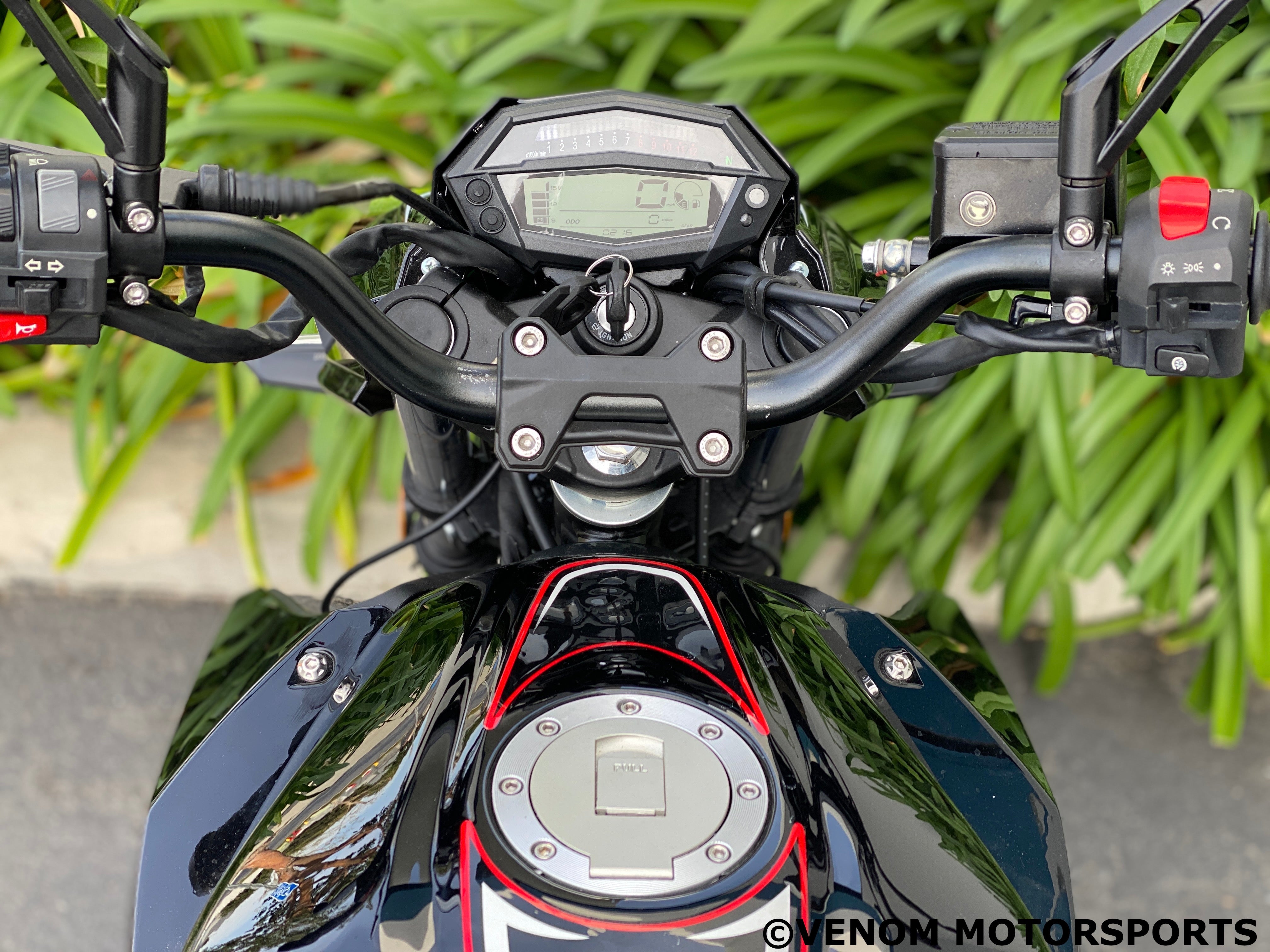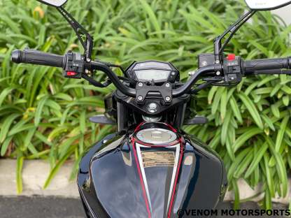 The Venom Z250 is the perfect beginner bike, modeled after the highly acclaimed Kawasaki Z-series. With a powerful 250cc EFI fuel-injected engine and 6-speed transmission, this motorcycle is both street and freeway legal. Start your riding journey with the reliability and style of Venom.